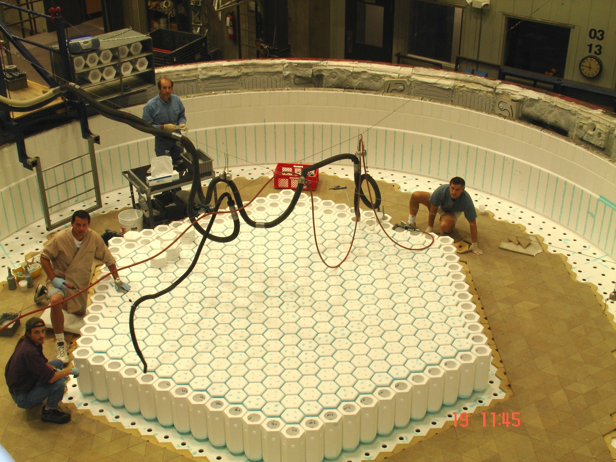 | fig. 8 – in questa immagine del Mirror Lab si nota la posa dei blocchi ceramici sui quali verrà fuso il blank di vetro. A raffreddamento ultimato i blocchi vengono rimossi e le cavità alleggeriranno di molto il peso del disco vetroso, riducendo spessori e tempi di adattamento termico. In questo caso si tratta di borosilicato E6 della Ohara. Nel telescopio NTT ESO si è anche sperimentata la tecnica di insufflare correnti forzate di aria fredda dentro le celle posteriori, in modo da rendere più veloce il raggiungimento della curva termica ottimale. Una ventilazione forzata “dentro” il disco di vetro. |