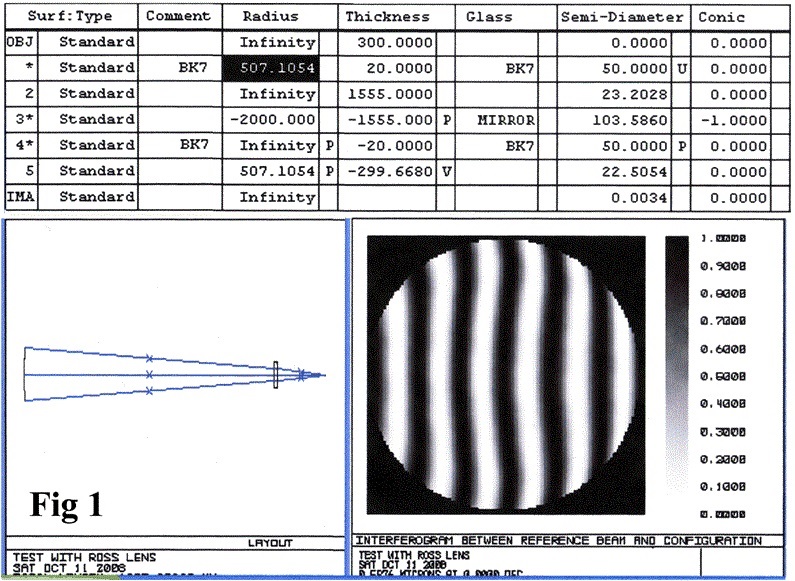 In this example shown (Fig 1), the mirror is a 200mm diameter F/5 parabolic mirror with a Ross lens tested at the centre of curvature. The basic optical layout of the mirror with Ross lens and focus position is shown at bottom left with the “Prescription” for the optical system above it.