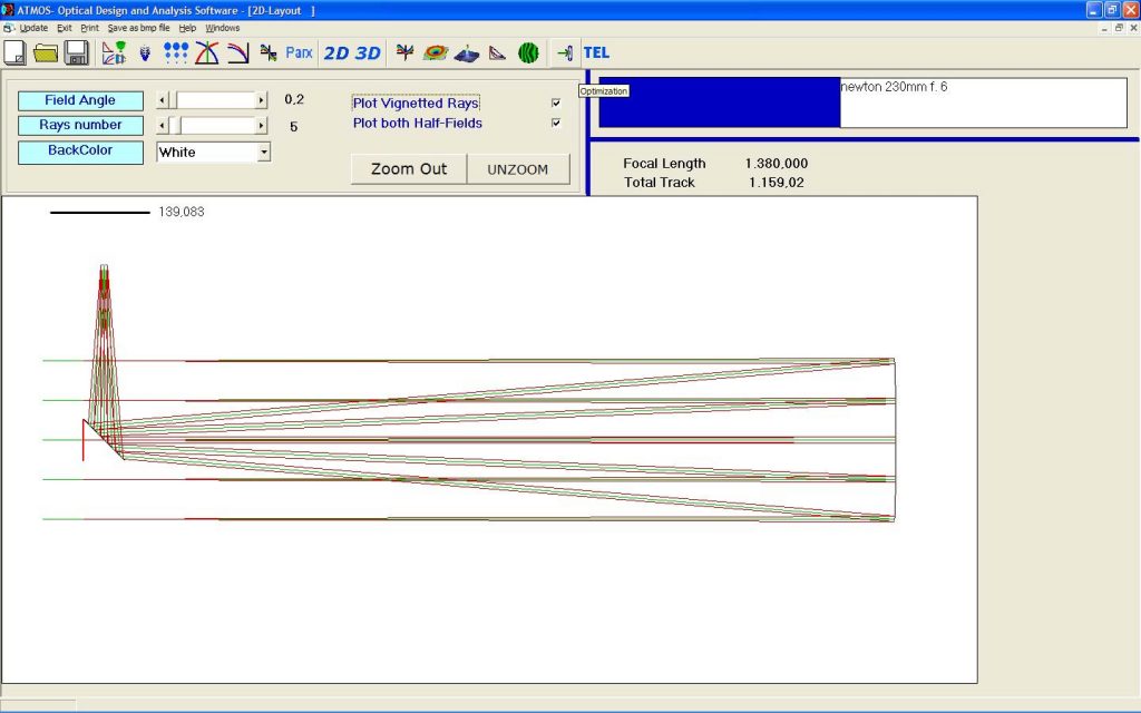 From a mechanical point of view this telescope follows the DK 230 characteristics, it has in fact the same cell and the same construction, a 2″ Feather Touch focuser but a modified support (AxyS A3) especially studied for Newton telescopes. The collimation is consistently accurate.