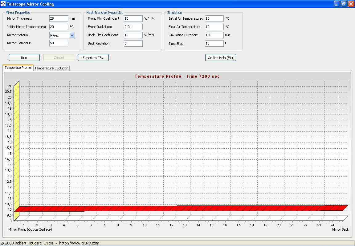 Let us now look at this further computation. We can see that we have started from 20 degrees C and after 120 minutes we have reached about 11.5 degrees, but let us carefully observe the red line which is the one that represents the “heart” of our glass disk. Only towards the end of the curve it gets near to the other two, and in any case the temperature delta is still quite high. Under these conditions, how important do you think it is the optical correction of your mirror? Observe also, always in Fig. 4, that the red line is slightly bowed and discover the reason why.