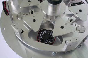 Così abbiamo optato per il Supremax 33 di Schott per quanto riguarda le ottiche, mantenendo il disco sottile (35 mm), in modo da consentire alla massa vetrosa di seguire in modo ottimale la varianza della temperatura durante la sessione osservativa. Non solo: alle tre ventole (diametro 60 mm) posteriori, abbiamo aggiunto tre ventole radiali che hanno il compito di eliminare lo strato di aria calda interfacciata alla superficie alluminata. Questo è un enorme vantaggio in alta risoluzione, perchè migliora – e di molto – la situazione prestazionale dell’ottica. Le ventole radiali e assiali possono essere comandate (opzionale) da una centralina elettronica che ne regola la velocità, essendo montate su supporti antivibranti è possibile mantenerle in moto a bassa velocità anche mentre si osserva. Un ulteriore possibilità è quella di avere sensori termici sul disco ottico e sulla struttura che lo sostiene, in modo da poter gestire l’andamento termico del telescopio.