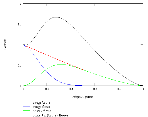 Tutti gli algoritmi di trattamento delle immagini destinati ad aumentare il contrasto lavorano nello stesso modo: amplificano le alte frequenze dell’immagine. E’ per questo che sono chiamati filtri passa-alto, e il più conosciuto tra questi è senza dubbio la maschera flou. Questa tecnica, difficile da mettere in opera in fotografia su pellicola, funziona nella ripresa digitale nel modo seguente ( figura sotto):